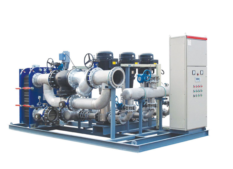 換熱機(jī)組的構(gòu)成及工作原理?yè)Q熱機(jī)組是集成板式換熱器、循環(huán)泵、補(bǔ)水泵、電控柜、溫控裝置、各種傳感器、熱量計(jì)、溫度計(jì)、壓力表、管路和閥1門(mén)等于- -體,并組裝在公共底座上的熱交換成套組合裝置。一次側(cè)熱源(蒸汽、高溫水等),經(jīng)過(guò)除污器過(guò)濾后,進(jìn)入板式換熱器與二次側(cè)循環(huán)水進(jìn)行熱交換,然后返回一次側(cè)回水管網(wǎng)。二次側(cè)循環(huán)水經(jīng)過(guò)除污器過(guò)濾、循環(huán)泵加壓后,進(jìn)入板式換熱器與一次側(cè)熱源進(jìn)行熱交換,然后進(jìn)入二次側(cè)供水管...